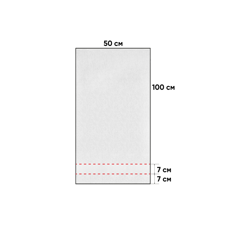 Рушник 100% бавовна, щільність 450 г/м2., розмір 100 х 50 см. Кількість у ящику 25шт., індивідуальна упаковка, поліетиленовий пакет. Подвійна стрічка на загибі, функціональна петля. По одному краю рушника є гладкий бордюр для нанесення логотипу, ширина бордюра 7 см. Рекомендована температура прання 40 градусів