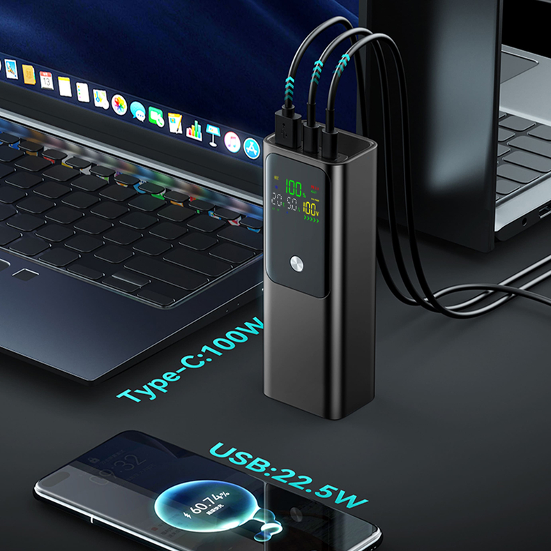 Універсальний зарядний пристрій. Полімерний акумулятор високої якості, широка сумісність. Корпус пристроюABS пластик. LSD дисплей. Має Quick charge Type-C вхід 1/2: 5V-3A, 9V-3A, 12V-3A, 15V-3A, 20V-3A Type-C вихід 1/2: 5V-3A, 9V-3A, 12V-3A, 15V-3A, 20V-5A (100W Max) USB вихід : 5V-3A, 9V-3A, 10V-2.25A, 12V-3A, 15V-3A, 20V-2.3A