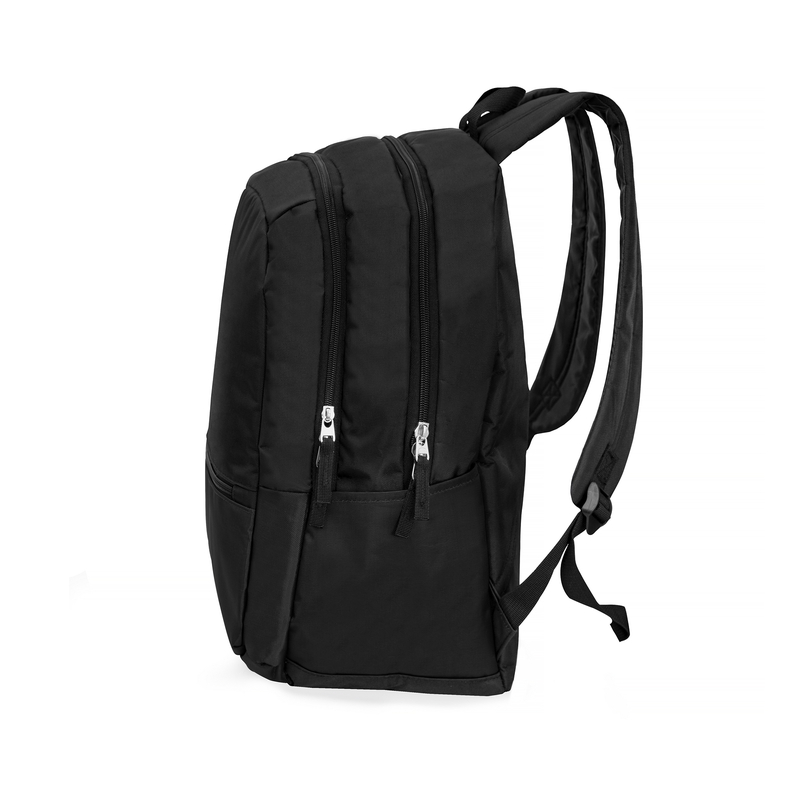Рюкзак для ноутбука 15,6 дюймів. Одне велике відділення з органайзерами та карабіном для ключів, окреме відділення для ноутбука і окреме для документів, попереду 1 кишеня та 2 відкриті бокові кармани. Ущільнена м'яка підкладка. Поліестер 600D.