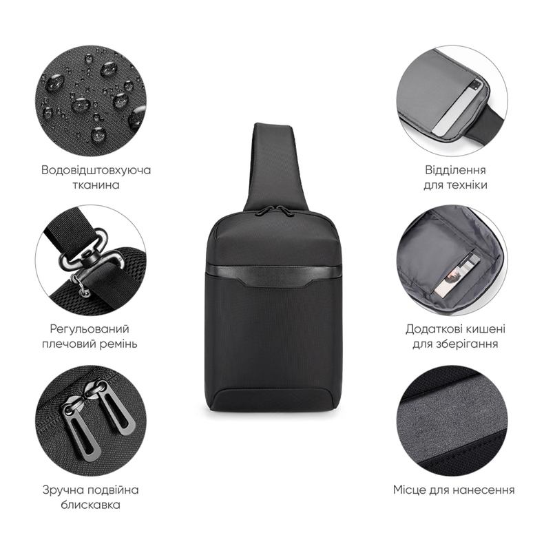 Рюкзак на одне плече.Тканина високоякісний водонепроникний 100% поліестер, застібка блискавка, має основний вітділ, вітділ для планшету, карман органайзер. М’яка спинка та лямка. Розмір: 30 х 21 х 8 см.